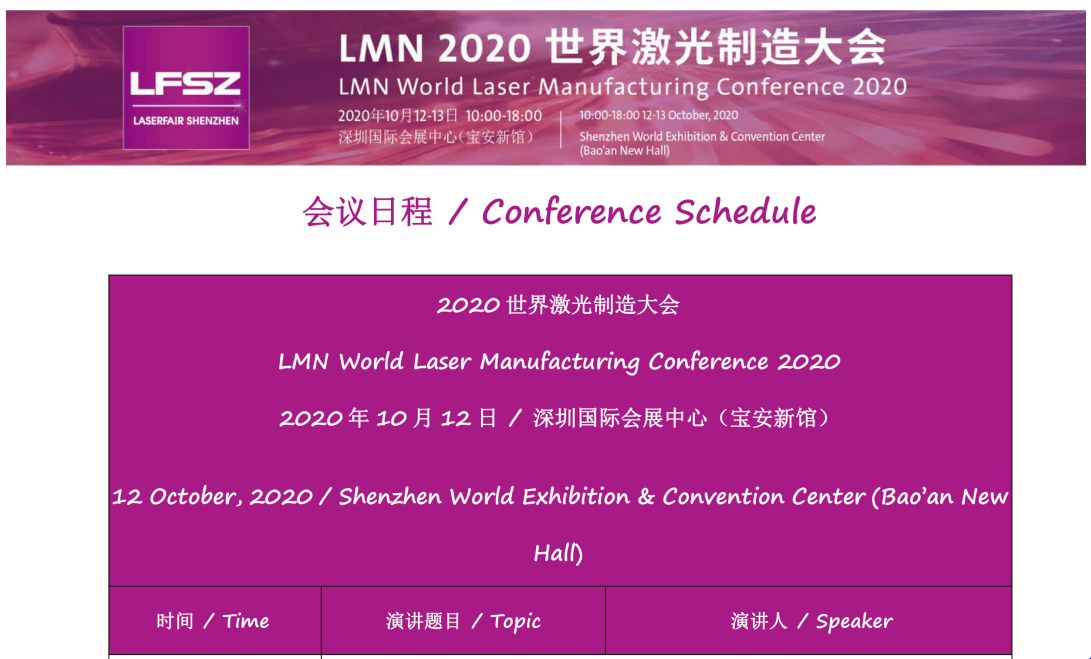 为助推中国激光产业腾飞、机遇变现,引进国际前沿的激光技术和创新理念,LMN 2020 世界激光制造大会将于2020 年10 月12-13 日在深圳举行。本次活动为主题展中国(深圳)激光与智能装备、光电技术博览会的重要组成部分,邀请各国激光权威专家、行业精英集聚鹏城,华山论道。更有众多同期活动精彩呈现,跟小编一起来解锁吧!LMN 2020同期活动会议议程(点击原图可放大观看详情)